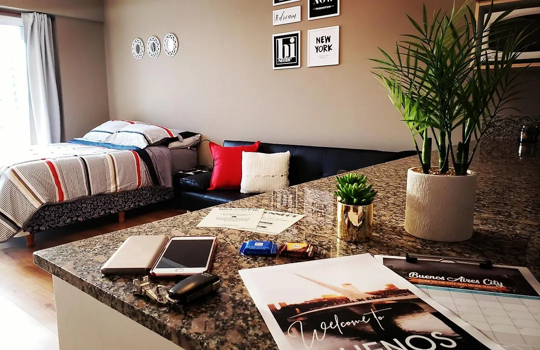 بوينس آيرس Modern Apartment Rivas - Swimming Pool ذات مساحة 36 م² تتألف من 1 غرفة نوم توفر اقامة لـ3 اشخاص. يمكن للضيوف استخدام خدمة النقل للمطار وخدمة غسيل الملابس وكذلك حوض السباحة الخارجي وتراس التشمُّس والمسبح على السطح.